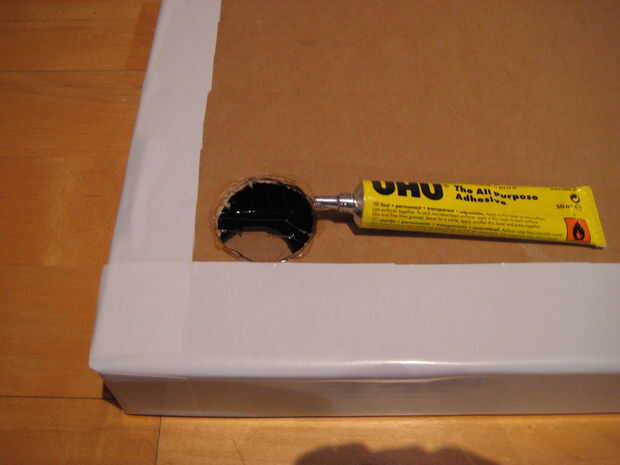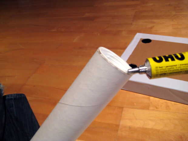 Poner pegamento alrededor del borde exterior de uno de los extremos de un tubo de un correo electrónico. Entonces puso poco de pegamento alrededor del borde de uno de los agujeros en la caja.