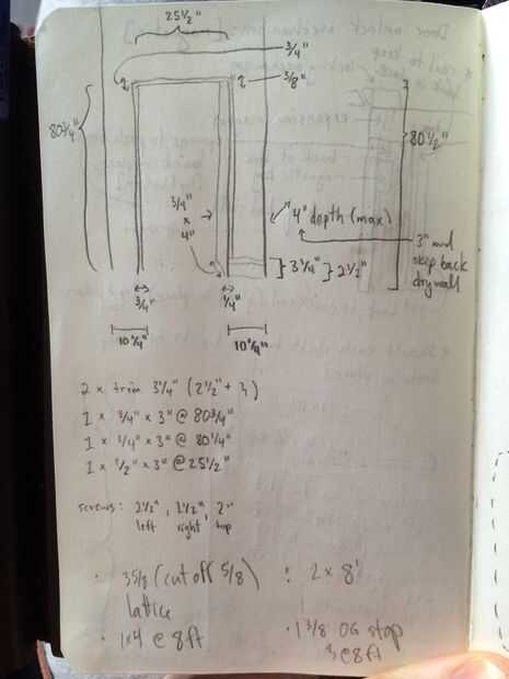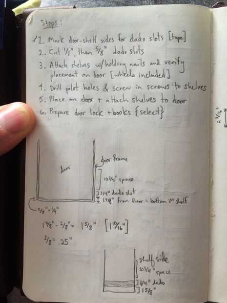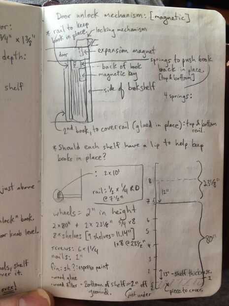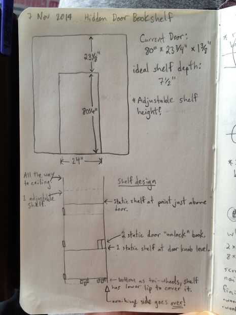 Mide la altura y la anchura meticulosamente (ver fotos de diagramas manuscritos de todo) y se decidió por una altura para cada plataforma (usa la altura de los libros que tenía como referencia). El diseño incluye un espacio en la parte inferior de la estantería para las ruedas de apoyo y pequeños labios en cada estante para proteger todos los libros. Además, la pieza de la puerta de la biblioteca tiene la altura de los libros de la estantería superior llegando a en la parte superior de la puerta--este libros de la manera en que estante superior cubriría la parte superior de la puerta y ocultar cualquier rastro de apertura, especialmente si era una luz en el interior de la puerta. Igualmente, la anchura de la estantería es 1/4" más ancha que la puerta en cuanto a ocultar el punto de conexión a la pared cuando está cerrado (alcanza más del lado de la bisagra no).
