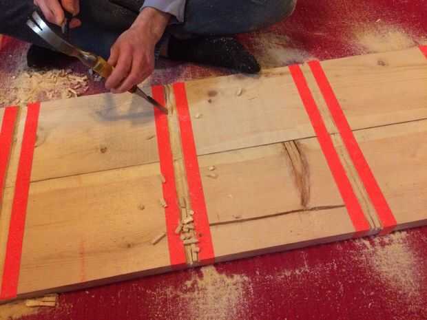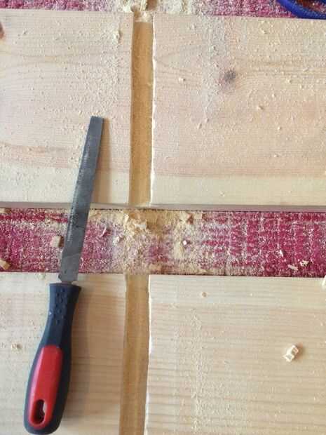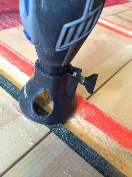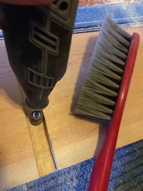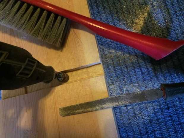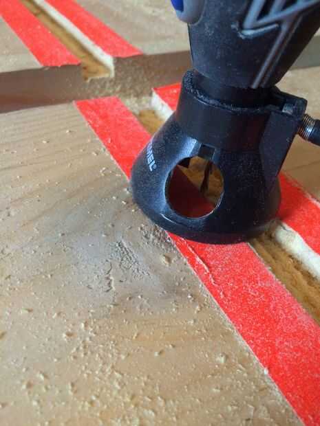 Utilizar mi Dremel con un accesorio de enrutamiento, ajustado a la longitud correcta (lo hice 1/2 pulgada primero y luego a 5/8 de pulgada para un lado para acomodar la extensión más allá del lado de la puerta). Tuve que hacer unos pases y rompió un bit de enrutamiento. Luego usé un cincel de mano y la herramienta lijadora Dremel para hacer las ranuras limpias.