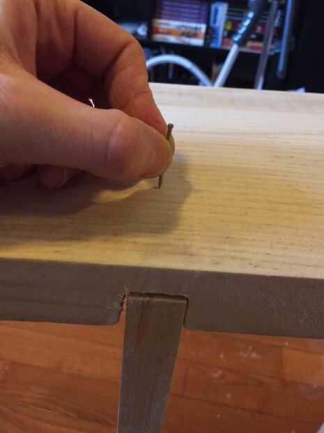 Una vez que enruta, he comprobado para asegurarse de que cada estante cabe en las ranuras del dado, luego agrega pegamento para madera y colocado en las uñas de "alambre" que compré para mantener alineamiento con los estantes mientras que taladrar orificios para los tornillos y luego atornillar los estantes en el lado con tornillos de 2 pulgadas.
