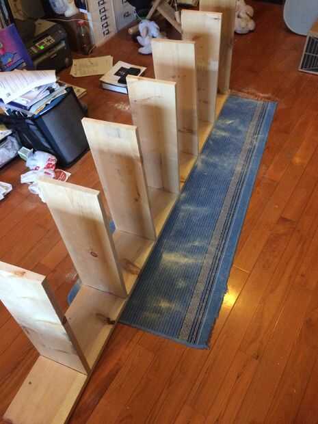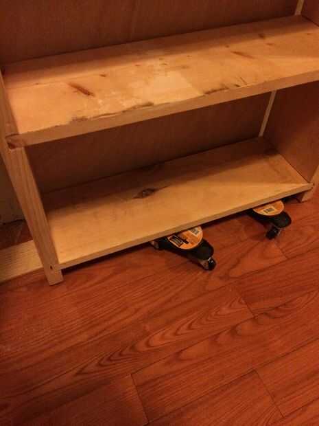 He medido la altura de los estantes (10,75") y había añadido los espesores de la plataforma, puesta en marcha 2" para la parte inferior [dejando el espacio para las ruedas].