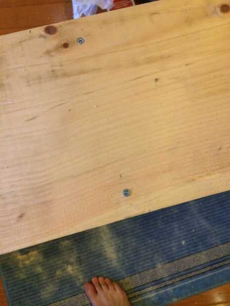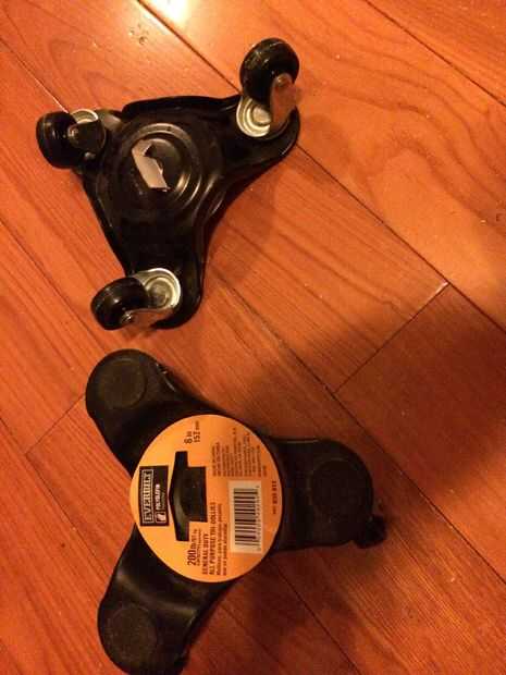 Una vez listos para la puerta, os adjunto las ruedas en la parte inferior de la bandeja (yo usé dos tri-ruedas he comprado en Home Depot y colocada en el exterior y el centro de la parte inferior de la puerta [del lado de la bisagra tendrá la bisagra que sostiene el peso, por lo que el otro lado será mucho mejor para la colocación y carga]). He medido y colocado las ruedas para que ellos no estar tocando el suelo durante el uso, y sólo si las bisagras no podían sostener el peso correctamente entran en juego y cargar peso con una puerta ligeramente partículos (algo así como entre 1/16 pulgadas de la tierra). Idealmente, la puerta abrió y cerró sin el sonido de las ruedas en el piso--también mantendría el piso más protegido. Como resultado, las bisagras son fuertes y las ruedas no han sido necesario hasta ahora.