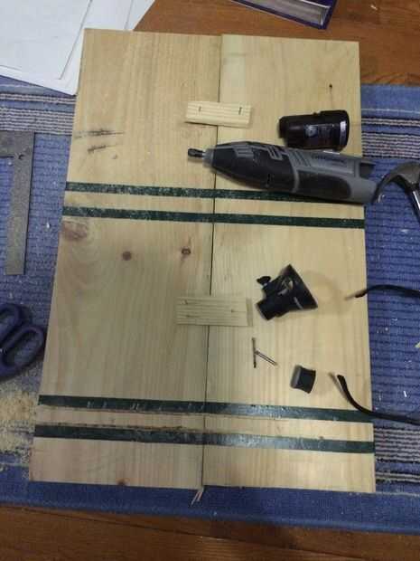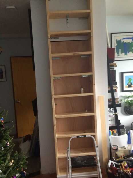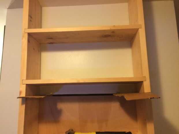 Otra vez, después de medir meticulosamente, cortar ranuras dado igual que con la estantería más grande creado anteriormente y colocar sobre la puerta sistema de estantería. En mi caso, darse cuenta de que la pared no es ni vertical ni horizontalmente de nivel y hacer ajustes como el mejor posible.