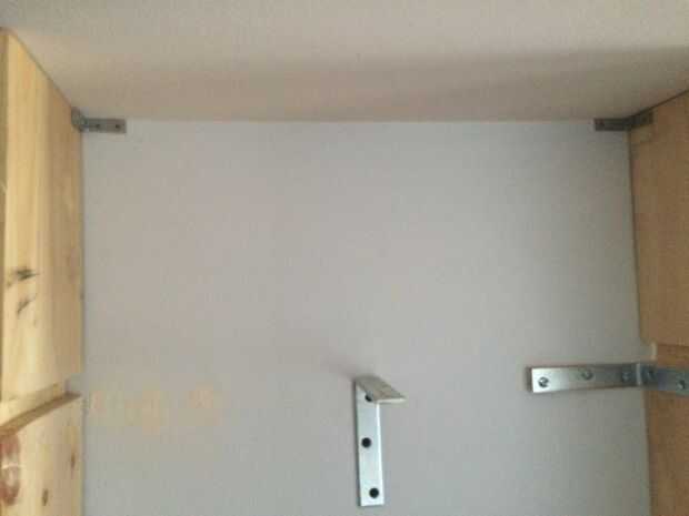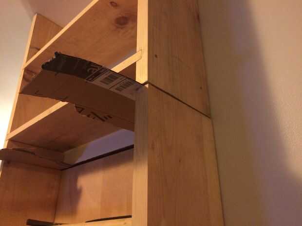 Coloque un cartón entre el estante inferior con el estante de la pared superior para asegurarse de que no es la fricción y luego fije el estante superior a la pared. Usé tarugos para asegurarse de que el peso no era un problema y encuentra la viga en la pared y se aseguró añadir un soporte adicional en el montante para el estante superior.