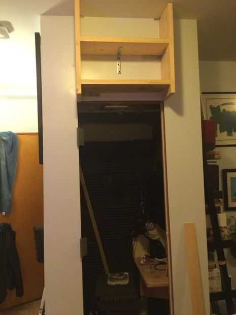 Ahora que tenemos el estante en la puerta, el estante fijado a la pared sobre la puerta completa nuestra ilusión.