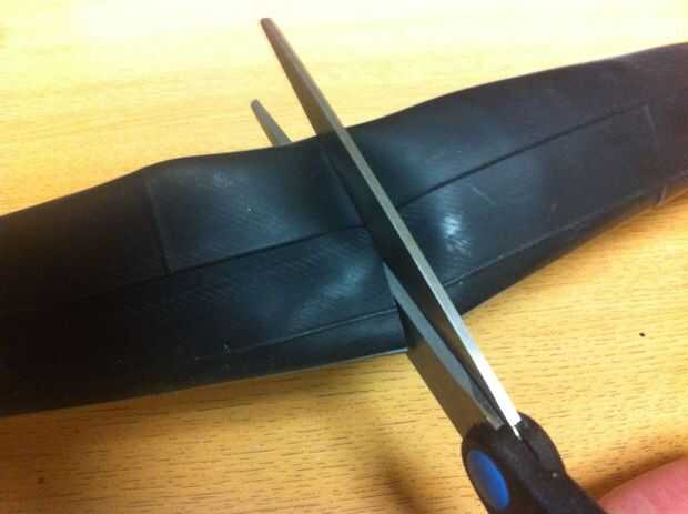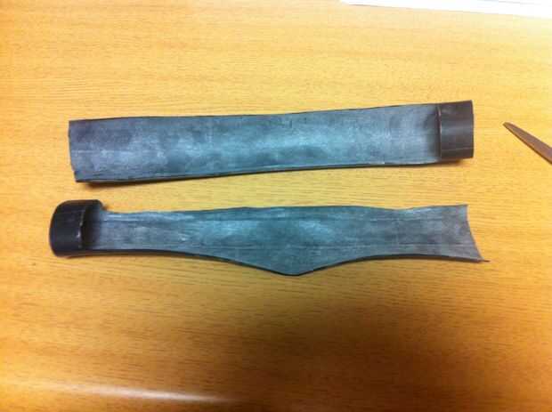 Usted debe terminar con dos piezas idénticas de caucho cortada para arriba que son esencialmente gruesas bandas de goma con una capa grande saliendo de él.
