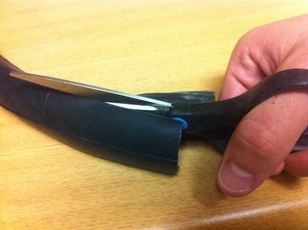 Usted desea cortar una buena sección de tubo de bicicleta. Asegúrese de que la parte cortada de no tiene cortes ni desgarros en él. Debe cortar el tubo de una pulgada más de lo que desea sus borlas que. El resto del tubo puede ser desechado o guardado para otro proyecto.