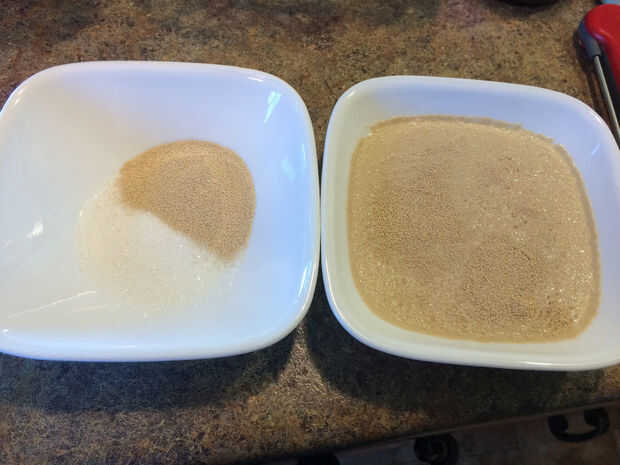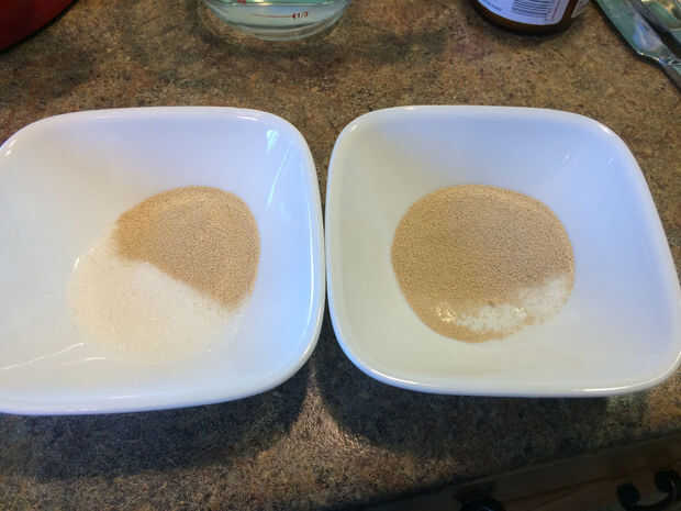 Para la prueba de su levadura necesita la levadura y el azúcar. Medida hacia fuera y agregarlos a un plato pequeño que pueda soportar más de media taza de agua.