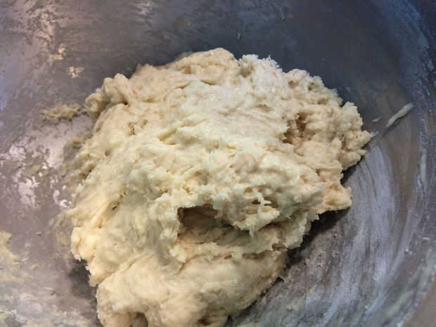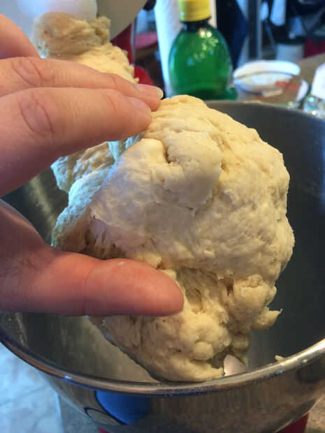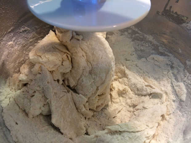 La masa va a ser muy húmedo, esto es normal. Agregar más harina poco a poco, hasta media taza, hasta que la masa de los lados de los tazones de fuente y es suave al tacto y no se pega a los dedos. Cuando llegue a este punto la mezcla durante dos minutos en medio.