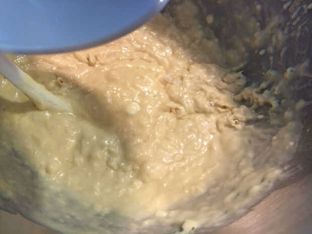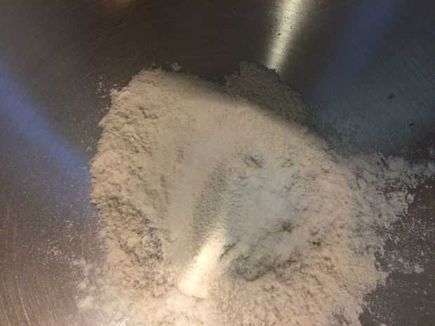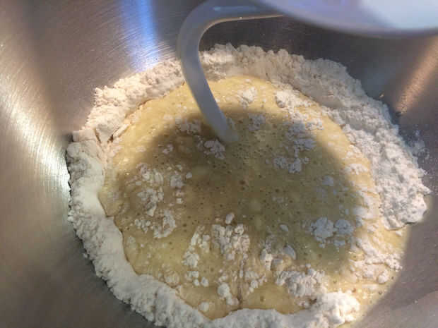 En el tazón de la batidora mezclar 2,5 tazas de harina y la sal. Mezcla un poco. Añadir los ingredientes húmedos al bol, sujetar el gancho y mezcla de bajo a medio bajo.