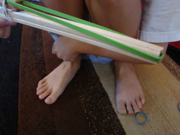Arte Stick goma pistola - Simple y fácil(Ver Video)Aquí está una manera fácil de crear un arma de doble banda de caucho de tiro con unos palitos y pinzas para la ropa. Las bandas de goma son fáciles de recoger y no causan daño. Por favor tenga cuidad