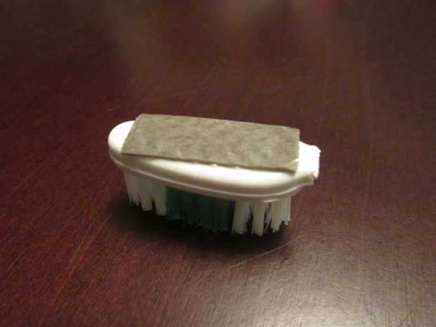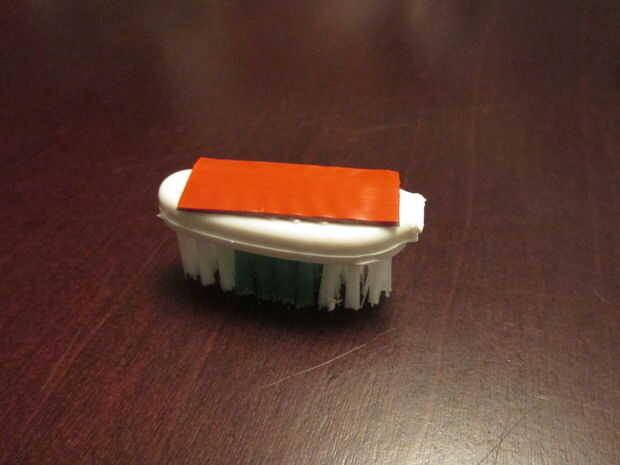 Nota: Asegúrese de que el vínculo entre la cinta y el cepillo de dientes es sólido. Un cepillo de dientes con volantes en la parte superior y la cinta debe tener un ajuste apretado. La versión de kit bristlebot tendrá esto instalado para usted.
