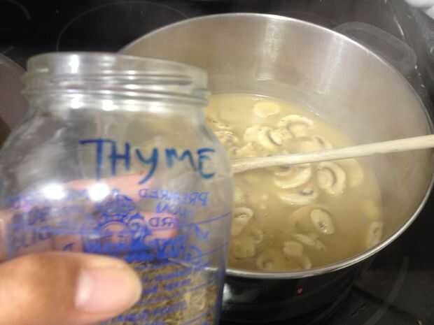 Añadir tomillo seco, revuelva y cocine hasta que se ablande setas