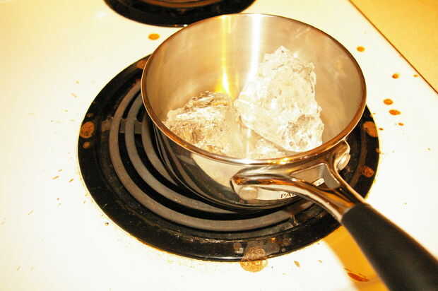 Tome su cera y colóquelo en una olla. Coloque la estufa en medio y fundirlo poco a poco.