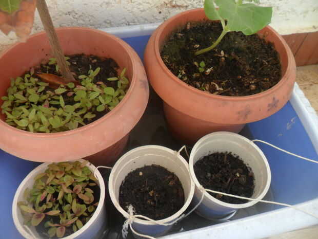 La última vez que fuimos de viaje por 10 días, tengo esta idea muy sencilla que fue un gran éxito. La idea era poner macetas dentro de un recipiente grande llenado de agua. mientras que las macetas tienen agujeros en la parte inferior