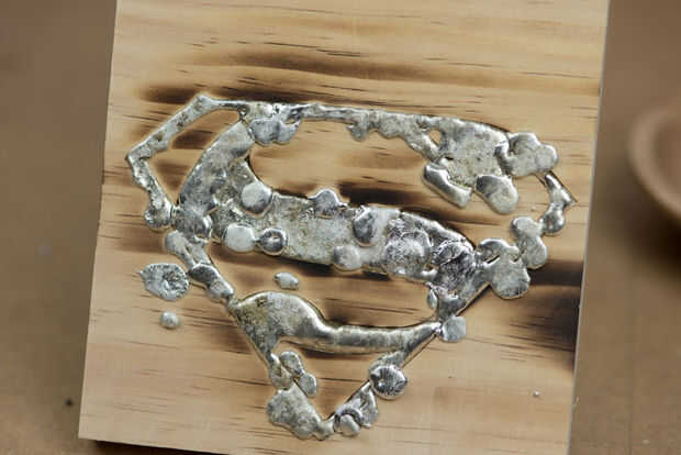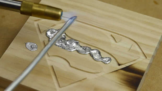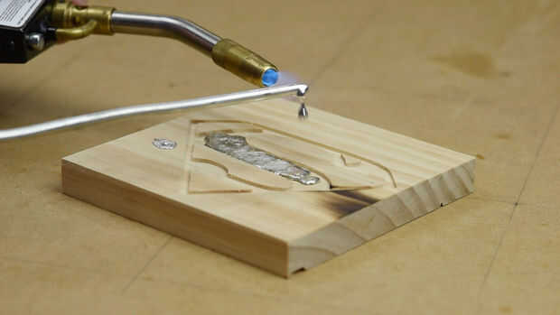Utilicé soldadura sólida que se utiliza en fontanería y usando un soplete derretido sobre la talla, encontré agrupar juntos funcionaba mejor como cada goteo se fusionaría con el a su lado, continuar hasta llenar el molde con soldadura.