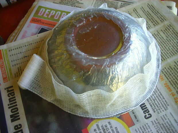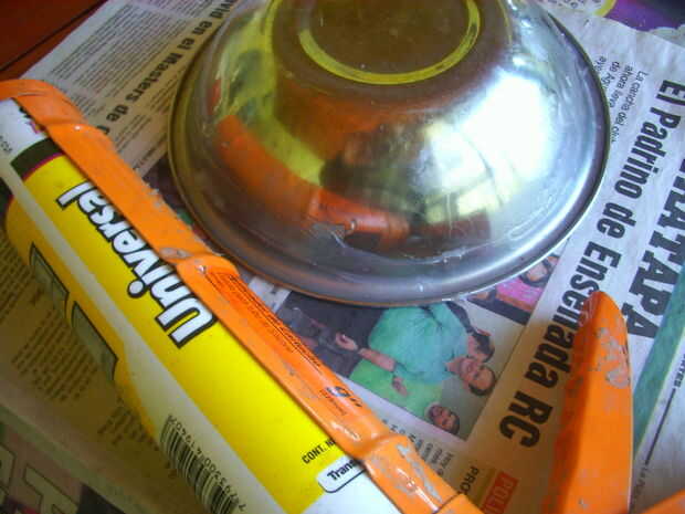 Le di dos capas de detergente en la superficie externa, como un agente de liberación. Ahora me di cuenta que hubiera sido mejor dar mas capas. Una vez seco el detergente, poner boca abajo el Bol en Deje que se seque la silicona y gasa