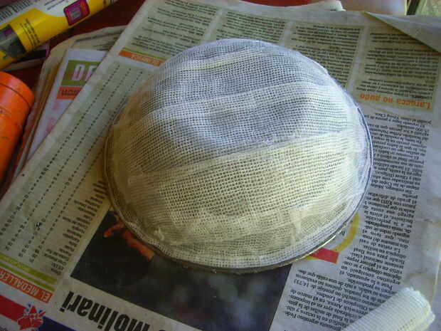 Una vez seco el detergente, la puse boca abajo sobre unos diarios para evitar ensuciar la mesa, y la cubrí con una capa de silicona, de más o menos dos o tres mm de grosor. Sobre esta capa, inmediatamente dispuse varias tiras de venda de gasa, haciendo quedaran bien pegadas dentro de la silicona. AVISO: esta parte es bastante desagradable, porque la silicona se mete por todos lados y hay tener pueblos a mano un trapo limpio para sacarla de los dedos antes de se Blizzard.