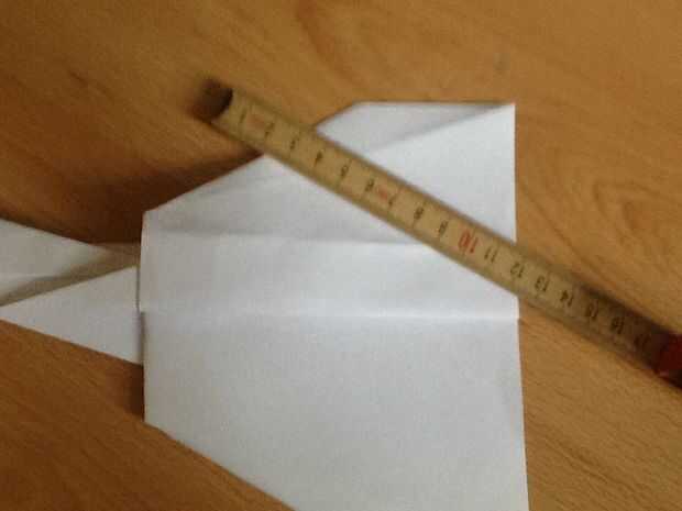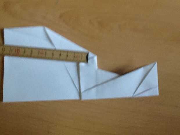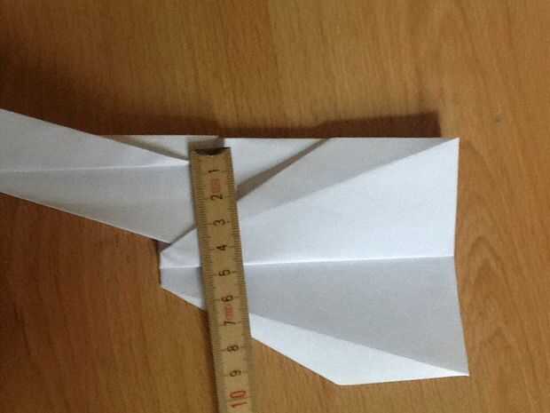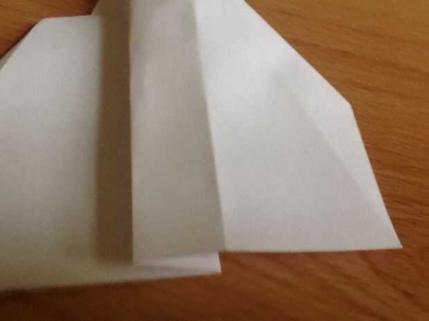 Doblar por la mitad y luego doble hacia abajo los canards, paralelo a la quilla. Luego doble la punta del ala hasta la quilla y luego doblar este doblez a la quilla.