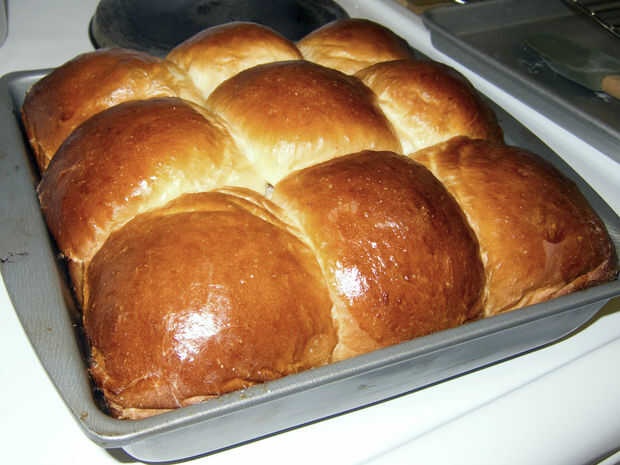 Finalmente, coloque la bandeja para hornear en el horno precalentado y dejarlo allí durante 15-20 minutos (esto puede variar dependiendo de tu horno). Los rollos se ampliar un poco más en el horno y tome un color caramelo oscuro. Retire el pan del horno y enfriar sobre una rejilla para enfriar durante al menos 5 minutos antes de su consumo.