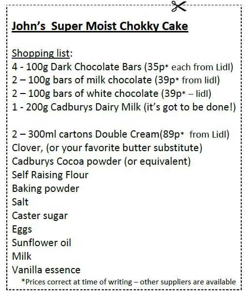 Ahora, Cadburys es una bendición. Si nunca has tenido de Cadbury chocolate entonces no sabes lo que estás falta, así que usted encontrará que usted puede hacer sin él e ir alrededor de no pensar en ello. Si han disfrutado de chokky dice pero ahora vive en Estados Unidos donde te puedes entonces compadezco. Usted tendrá que buscar seriamente un reemplazo, o venga a visitarnos. Aquellos que viven en Bournville, Birmingham, Inglaterra... traen!!!!!! (Coventry no está muy lejos de dicha fuente de placer que complace). Te darás cuenta que no estoy usando Bournville Chocolate de Cadbury oscuro, no porque su no tan excelente como su chocolate con leche, sino porque es tal un rico poderoso sabor toma más... así que usar una más barata, menos ricos, chocolate negro.