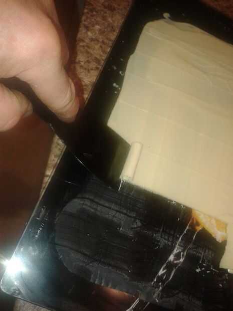 Derretir bien el chocolate, blanco esparcido sobre el vidrio, ponerse de nuevo en el congelador. Sentarse, tomar una respiración profunda... Sacar el chocolate blanco de la nevera y romper el cristal con el raspador, poner en otra caja en la nevera. Lavarse para arriba! (no se ilustra arriba...)