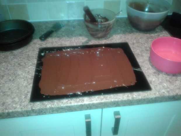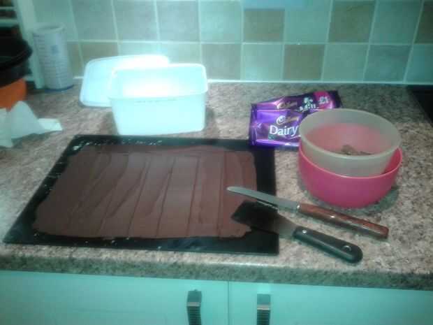 Leche: Limpiar el tazón de fuente pequeño, romper el 200g Cadburys Dairy leche en un tazón pequeño, añadir 1 cucharadita de aceite de girasol, asegúrese de que hay suficiente... pero no demasiado... agua en el tazón de fuente grande, microondas durante un par de minutos. Mientras tanto salir de la oscuridad comportó la nevera y con el raspador de Levante el choky desde el vidrio para hacer interesante la metralla o empuje el raspador por debajo para hacer rizos. Poner en una caja en la nevera. Asegúrese de que el cristal esté limpio, vuelva a colocarlo en el frigorífico.