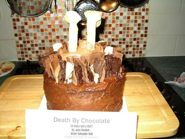 Como se puede ver, yo he estado haciendo variantes de este pastel durante algún tiempo (...) Incluso he tenido una cocina nueva en aquel momento [tuvimos encimeras verdes, ahora tenemos marrón...]) Lo más extraño era un pastel etiquetados como "Después de Salvador Dalí" presenta jalea bebés morir de éxtasis en un lago de chocolate!