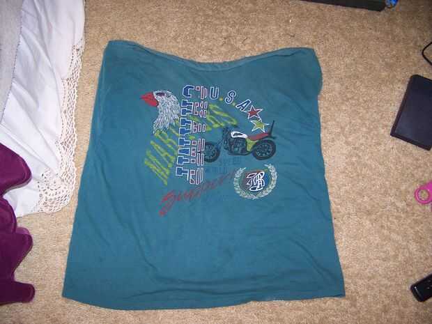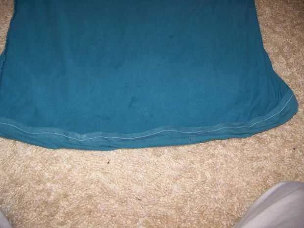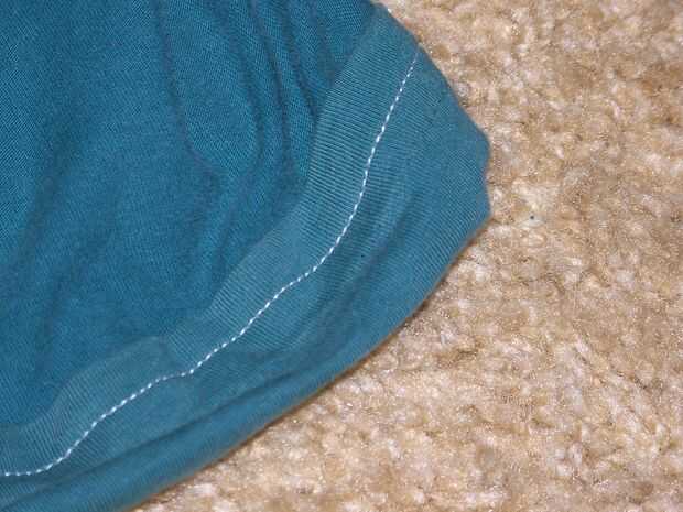 Ahora, última parte antes de girar a la derecha de la camisa hacia fuera. Tomar el dobladillo de la camisa y dóblalo hasta cerca de 1 pulgada todo el camino alrededor. Vas a coser este dobladillo a la camisa todo el camino alrededor de la parte inferior de la camisa dejando un espacio de 1 pulgada para insertar el cordón en más tarde.