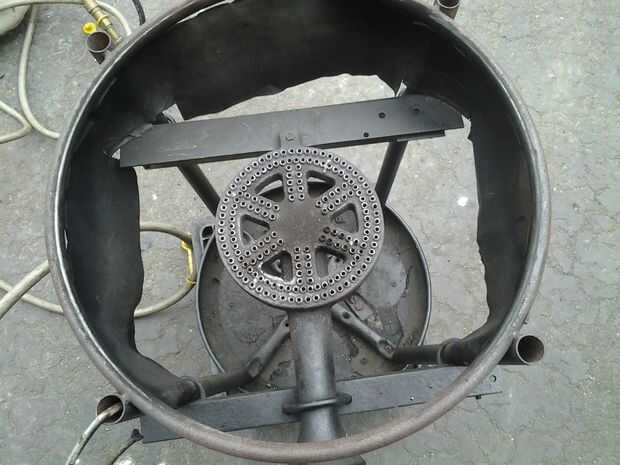 montar 8 pulgadas quemador aproximadamente 6 pulgadas por debajo del anillo del pie, esto permitirá el suficiente aire crear un patrón de calor incluso agradable - use trozos de ángulo de hierro y las abrazaderas como sea necesario para una sujeción segura, en mi caso se trataba de un quemador de gas natural vintage de un calentador de agua circa 1930