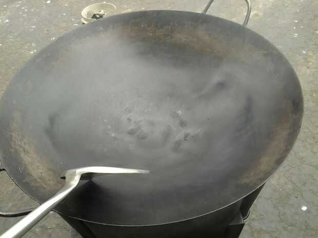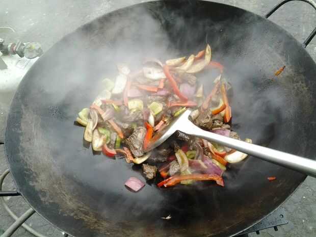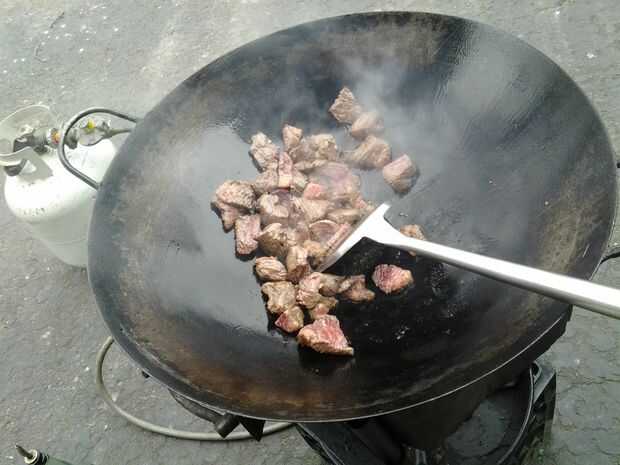Haz wok, smokin caliente y tirar en solamente pequeña cantidad – aproximadamente 4 pulgadas cúbicas máximo (eso es la mejor manera que puedo describir) - swish alrededor de pala de Wok, así la forma de la pala raspa los lados y funciona mejor - quitar carne en medio o raros, no cocine demasiado