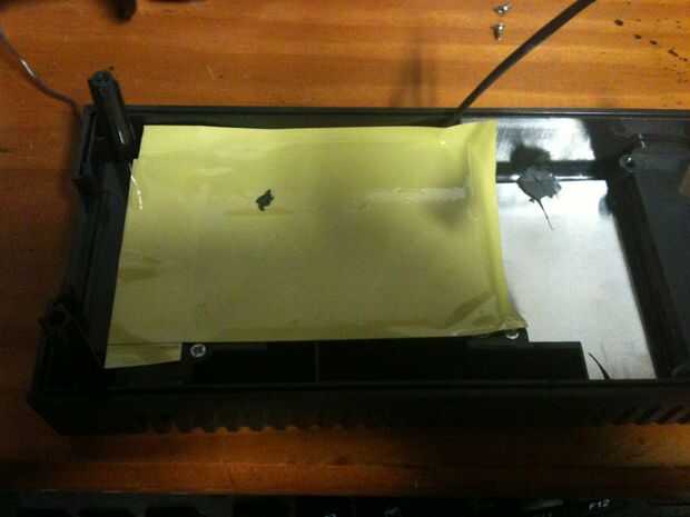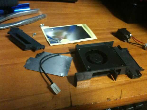 Necesitamos la tripa hacia fuera la parte superior de la carcasa. Retire los tornillos que ves. Quitar ese feo trozo de plástico amarillo y la hoja de aluminio y retire los tornillos. Es el ventilador. Llevarlo a cabo. Tomar el ventilador fuera de la Asamblea y guardar para otro proyecto. Ahora pasemos
