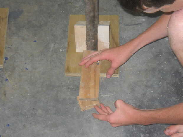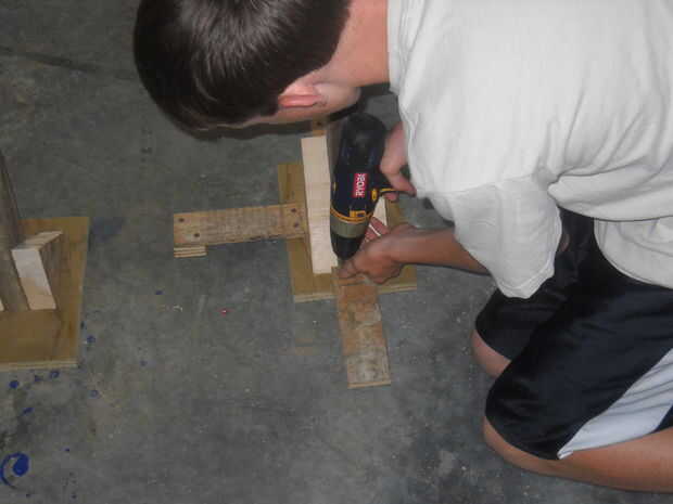 Corte hacia fuera seis tablas de 8 "x 2,5" y atornillarlos en el pecho, la espalda. y los lados de ambos pilotes. Luego cortar seis cuadras para hacer las tarjetas de apoyo al mismo nivel que la placa base. No los necesita en su interior partes de los zancos porque eso no es una de las maneras caería. Deslice un bloque debajo de la placa de soporte y enrosque.