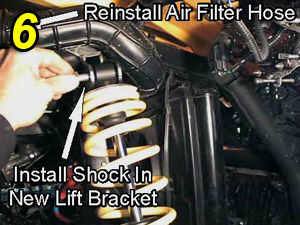 Una vez que los tres pernos se instalan libremente, instale el amortiguador en el nuevo soporte de elevación con la M10x55mm largo perno de cabeza hexagonal, arandela y tuerca de seguridad.  Una vez que el choque es firmemente en su lugar, regresar y apriete todos los tornillos y vuelva a instalar la manguera de aire. Repita el proceso en el otro lado.