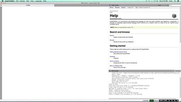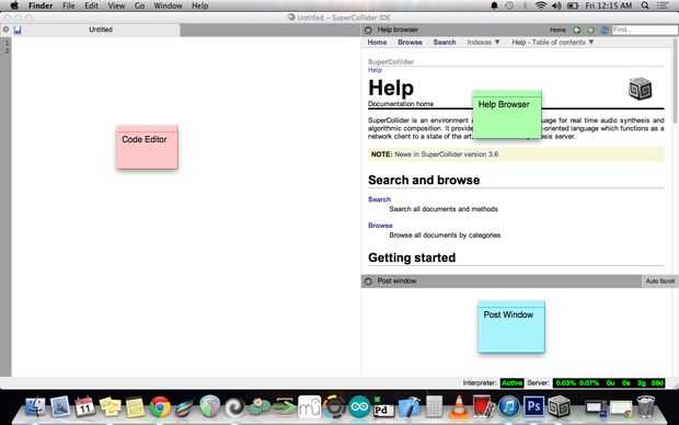 Espacio de trabajo de superCollider consta de tres partes principales: el editor de código, ayuda de navegador y después de ventana. El editor de código es donde escribir nuevas líneas de código y ejecutarlas. El navegador de ayuda es un recurso útil para encontrar más información sobre varias partes de la sintaxis y las funciones que se construyen en SuperCollider. La ventana del post es donde se imprime el resultado de lo que se ejecuta y es útil para la depuración y asegurándose de que todo está funcionando como debería.