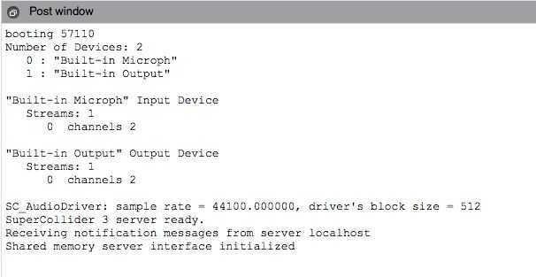 Listo el servidor superCollider 3. Recibir mensajes de notificación de servidor localhost Shared memoria interfaz de servidor inicializado