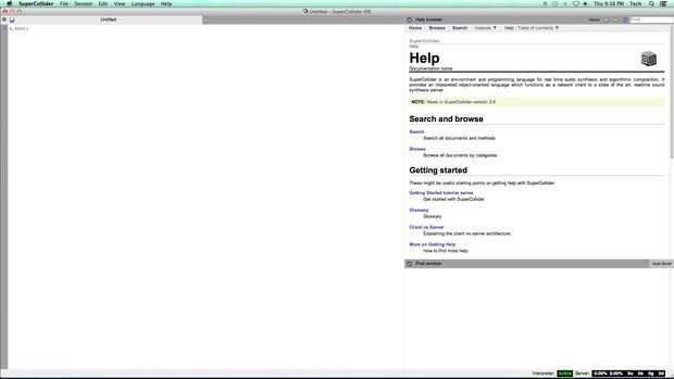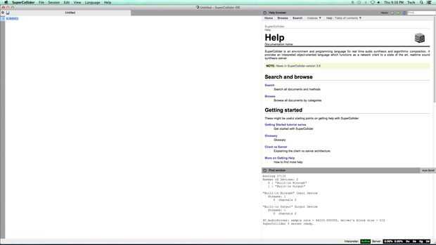 Para llevar a cabo síntesis código en SuperCollider (y sonido), debe arrancar el servidor. Como se explicó en la introducción, SuperCollider es un lenguaje orientado a objeto que funciona como un cliente de red a un servidor de síntesis de sonido en tiempo real.