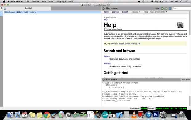 Ahora es el momento para hacer algo de ruido! Pero antes de empezar su lujo nuevo oscilador oscilante, voy a decirle cómo pararla (esto era un ganado difícil lección para mí en mi terquedad infinita). Si utilizas un Mac, para detener cualquier señal de SuperCollider en cualquier momento, haga clic en la ventana de SuperCollider y presione comando +. (período). Si utilizas un PC, presione CTRL +. (período).
