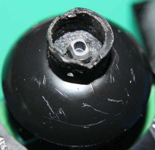 Con mi toma lo suficientemente profundo para el palillo de la RC, el eje de la Asamblea de joystick resaltó en la parte inferior de la toma, previniendo el palo RC de empalme montada, así que tuve que perforar la base del RC del palillo aproximadamente mitad de camino, para que le cupiera.