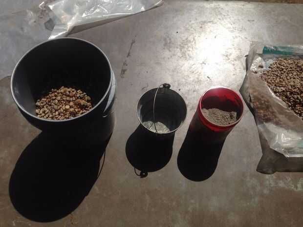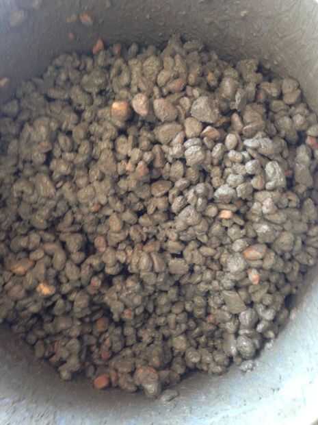 Concreto permeable se hace de cemento Portland, agregados, agua y arena (en pequeñas cantidades). Usé sólo cemento Portland y agregado. Mida la cantidad necesaria para llenar el formulario utilizando una escala. Asumir que el agregado llenará todo el espacio en el formulario. Usé una proporción cemento: agregado de Portland de 1:5 por peso y una relación de 1:0.33 para agregado: agua por peso. Mezclar hasta que el agregado tiene una capa de pasta de cemento, pero todavía hay espacio para el agua para moverse a través de los poros. Agregue agua o cemento Portland. He creado dos mezclas diferentes. Uno hecho con grava y una mezcla hecha con piedra caliza triturada.