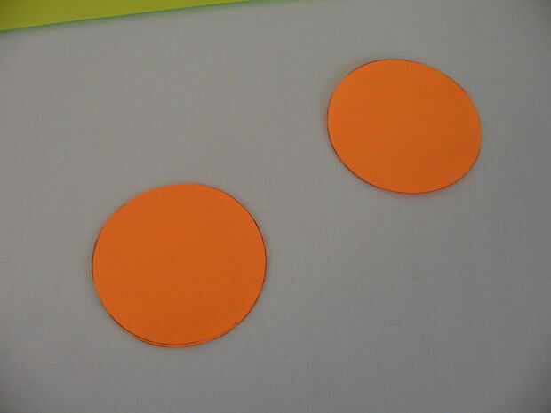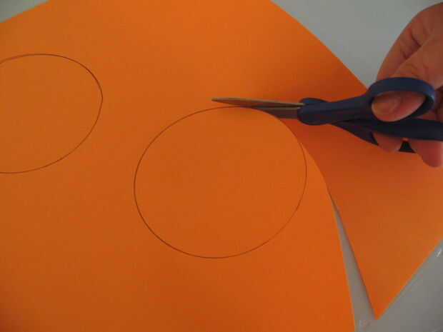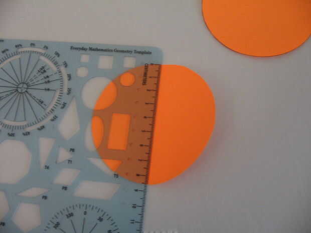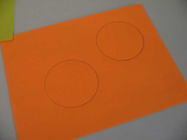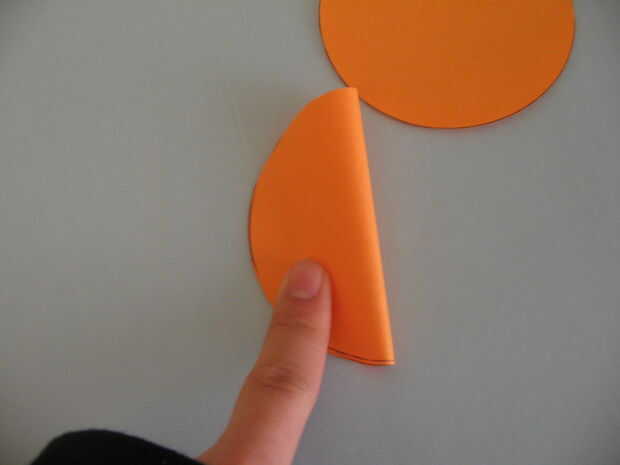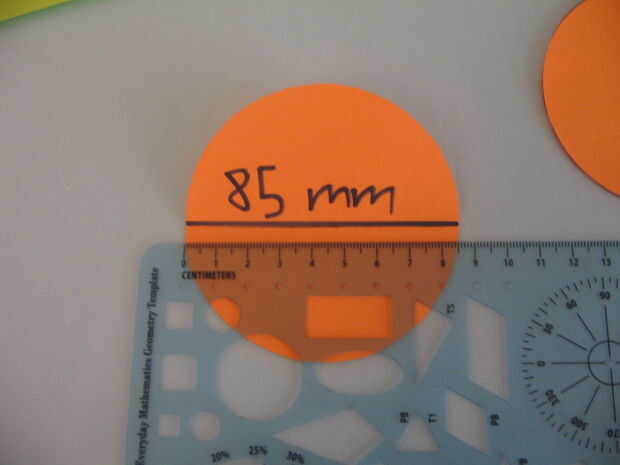 En primer lugar, encontrar un objeto circular y dos círculos traza a algunos papeles de colores. Recorto. Doblar por la mitad y usar una regla para measer el pliegue (el diámetro de un círculo). Para ayudar a recordar, escribí el diámetro en uno de los círculos.
