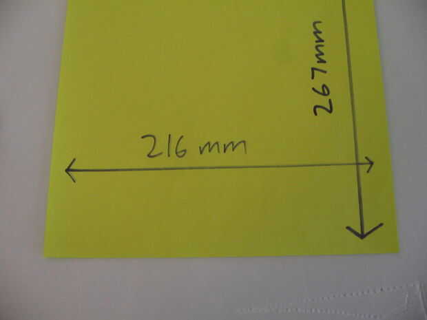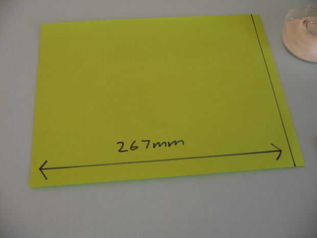 Así, al final, la circunferencia tenemos fue 267 mm. medida de 267mm en otra hoja de papel de color y recórtalo. Mientras estás en ello, medir el ancho del papel, también. Les anoté en el papel que me ayude a recordar.