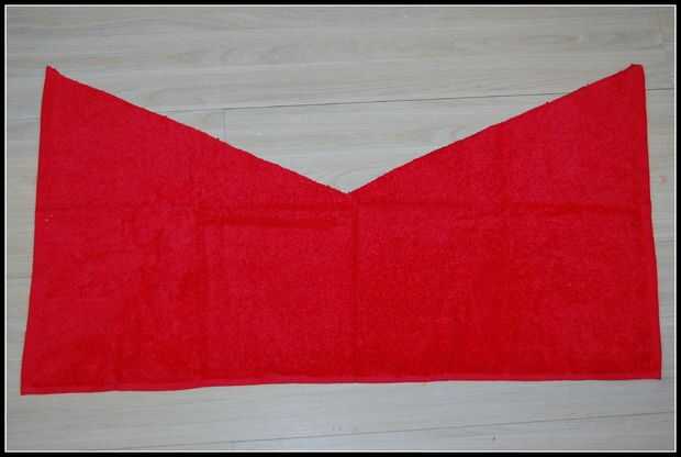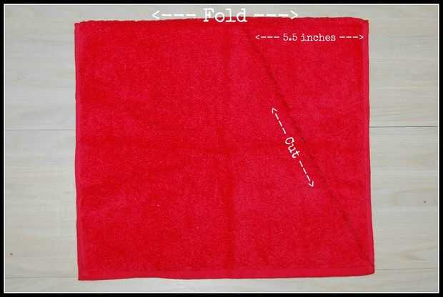 La toalla es super sencilla de hacer. Para formar la "campana" de la toalla, tomar la toalla de mano y dóblela por la mitad a lo ancho. Mida 5.5" en a lo largo de doblez y corte de eso marca a la esquina.