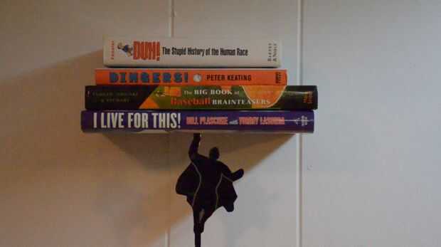 Para montar el superhéroe flotante estante, atornillar el soporte a la pared y me colocan el primer libro, excepto para la contraportada en la parte superior del soporte. La cubierta quedará abierta con solapas, pero debido a que utiliza un imán en la mano de la abertura del superhéroe, el imán ayudará a mantener la cubierta para arriba. Algunos libros más para ocultar el resto del soporte de la pila.
