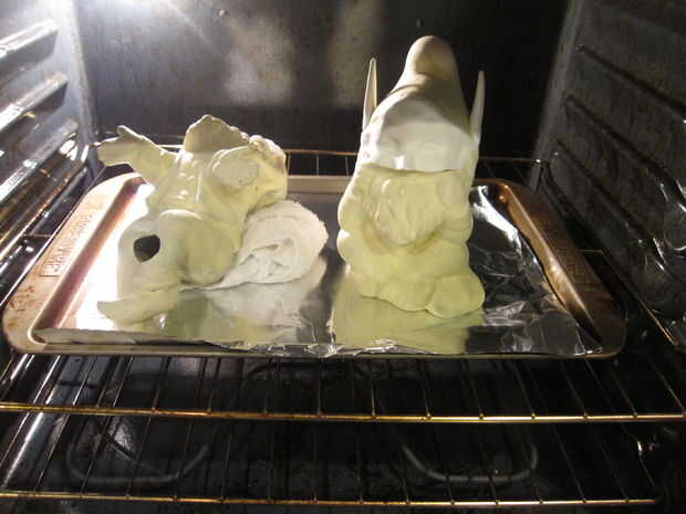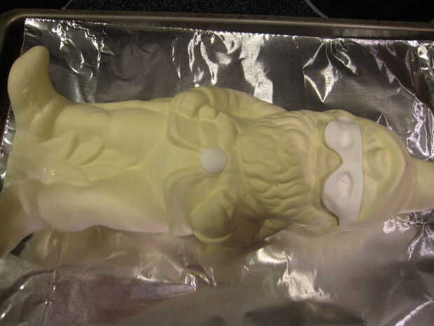 Una vez que los gnomos están decorados es el momento de hornearles. SCULPEY es una arcilla de polímero de horno-cueza al horno. Es tan suave y plyable hasta que se cuece al horno. En primer lugar, calentar el horno a 275 grados F. Mientras el horno se precaliente poner algún papel en una cookie de hornear. Entonces cuidadosamente puesto a los gnomos en las galletas, teniendo cuidado de no dejar que el toque de Sculpey la hoja o la parrilla. Poner al gnomo entero en el horno y hornear durante 15 minutos. Poner el bat a rang en la hoja también. Puesto que el gnomo es cerámica es seguro poner en el horno. El horno que fue despedido en era mucho más caliente que el horno de la cocina. Cuando los 15 minutos se sacan y dejan enfriar completamente a temperatura ambiente. Nota: si sus piezas de Sculpey son más gruesos de unos 6mm entonces usted puede hornee unos minutos más de 15 minutos.