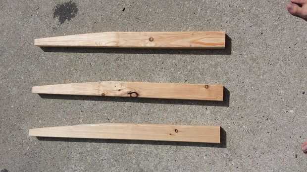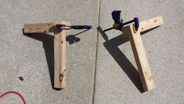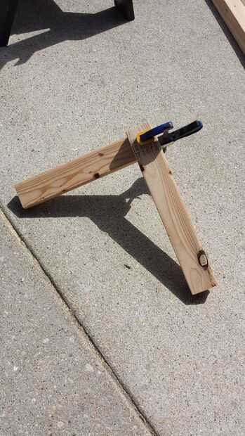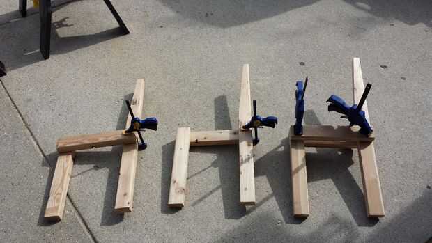 Pegan todas las piezas como se muestra la creación de un centro conjunto de piernas y dos conjuntos laterales de las piernas, de fijación hasta que se seque. Para cada una de las piezas laterales pegan una 16" y 14" en un ángulo de 90 grados, luego agregué un 32" pieza al otro extremo de la 14" pieza, creando lo que parece una minúscula «h». Finalmente una segunda 14" pieza se pega en cerca de 6 pulgadas por debajo de la primera. Para el medio es esencialmente el mismo procedimiento pero habrá un total de cuatro 14" piezas utilizado, dos a cada lado de la"h"