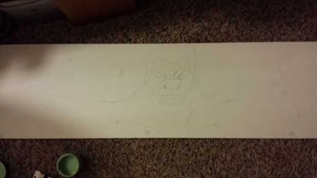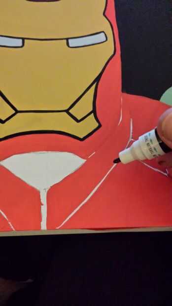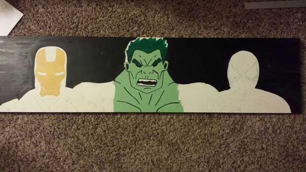 El primer paso en la pintura de los superhéroes fue dividir el respaldo en cuatro partes iguales para que cada personaje se centra en una tercera parte de la Junta. Después de encontrar algunas imágenes en internet de referencia dibujaba cada carácter en lápiz y luego pintar sus colores principales en (opté por usar sólo algunos colores por personaje para ahorrar pintura y agregar una viñeta más efecto). Cada personaje terminó necesitando 2 o tres colores y una vez que ésos fueron pintados en unos abrigos fui con plumas de la pintura para añadir las líneas y detalles. Una palabra de advertencia acerca de plumas de la pintura; mientras están secos al tacto relativamente rápidamente, se manchan si va pintura húmeda sobre ellos. Mejor que se deje secar durante al menos una hora o más.