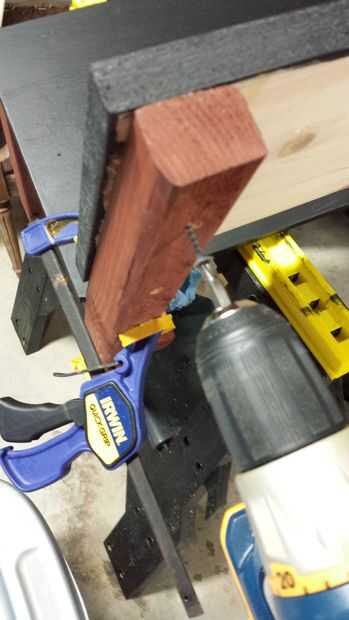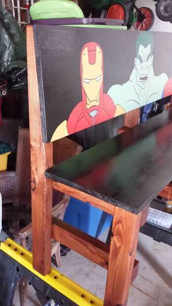 Después de que los personajes son pintados en, I perforados agujeros en los puestos de trabajo de banco, añade pegamento y sujeta el respaldo a los postes. Siguió esto con tres tornillos por cada post, uniéndolas al respaldo.