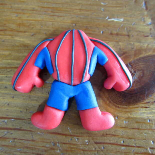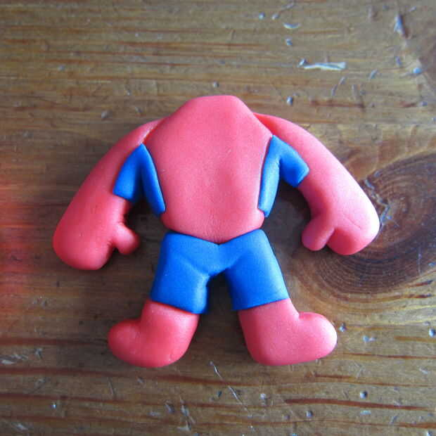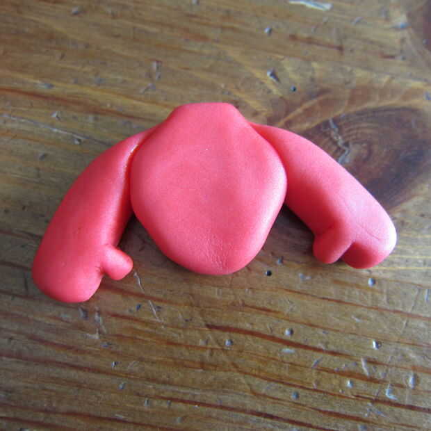 2. con un cuchillo de mesa corte la forma del cuerpo y los brazos como en la imagen 6. Usted está haciendo la parte superior del cuerpo y los brazos. Redondear los bordes con los dedos para dar la dimensión de la pieza.