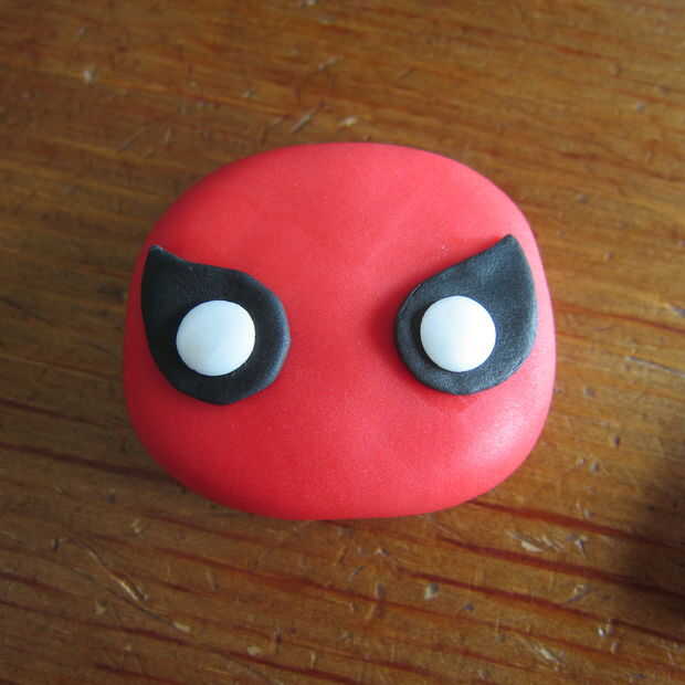 2. Presione (o rollo) dos piezas de fondant negro para aproximadamente 1/16 de pulgada. Corte dos formas de gota para los ojos. Pega a la pieza principal.